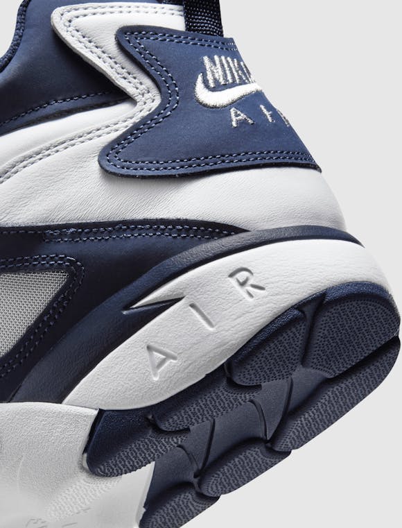 High top sneakers. Leather upper with suede accent overlays. Velcro strap across the forefoot. Front lacing. Embroidered logo motifs on the heel counter, and tongue. Composite foam midsole with an exposed air unit at the heel. Rubber outsole. Leather upper