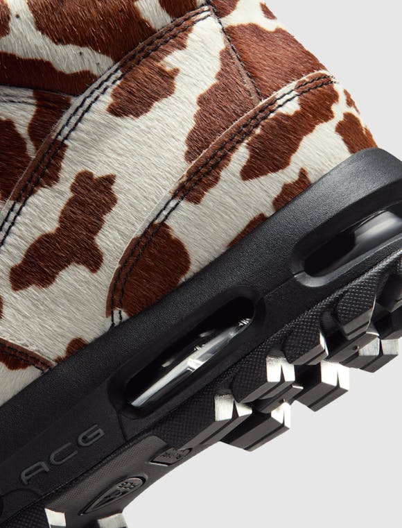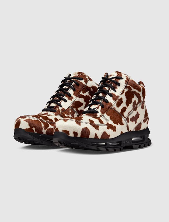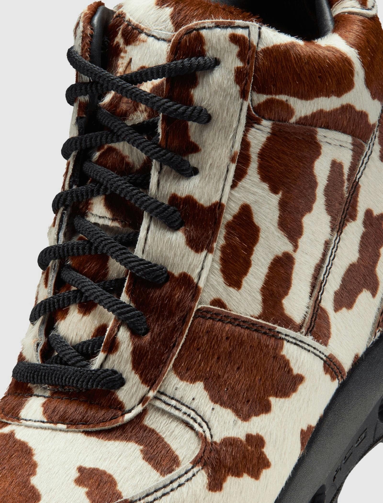High top boots. Calf hair upper. Calf hair overlays around the toe, eyelet panels, side panels, heel counter, and collar. Front lacing with silver-tone D-ring eyelets. Padded calf hair tongue. Composite foam midsole with a full-length air unit. Rubber outsole. Calf hair upper