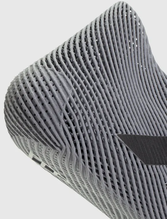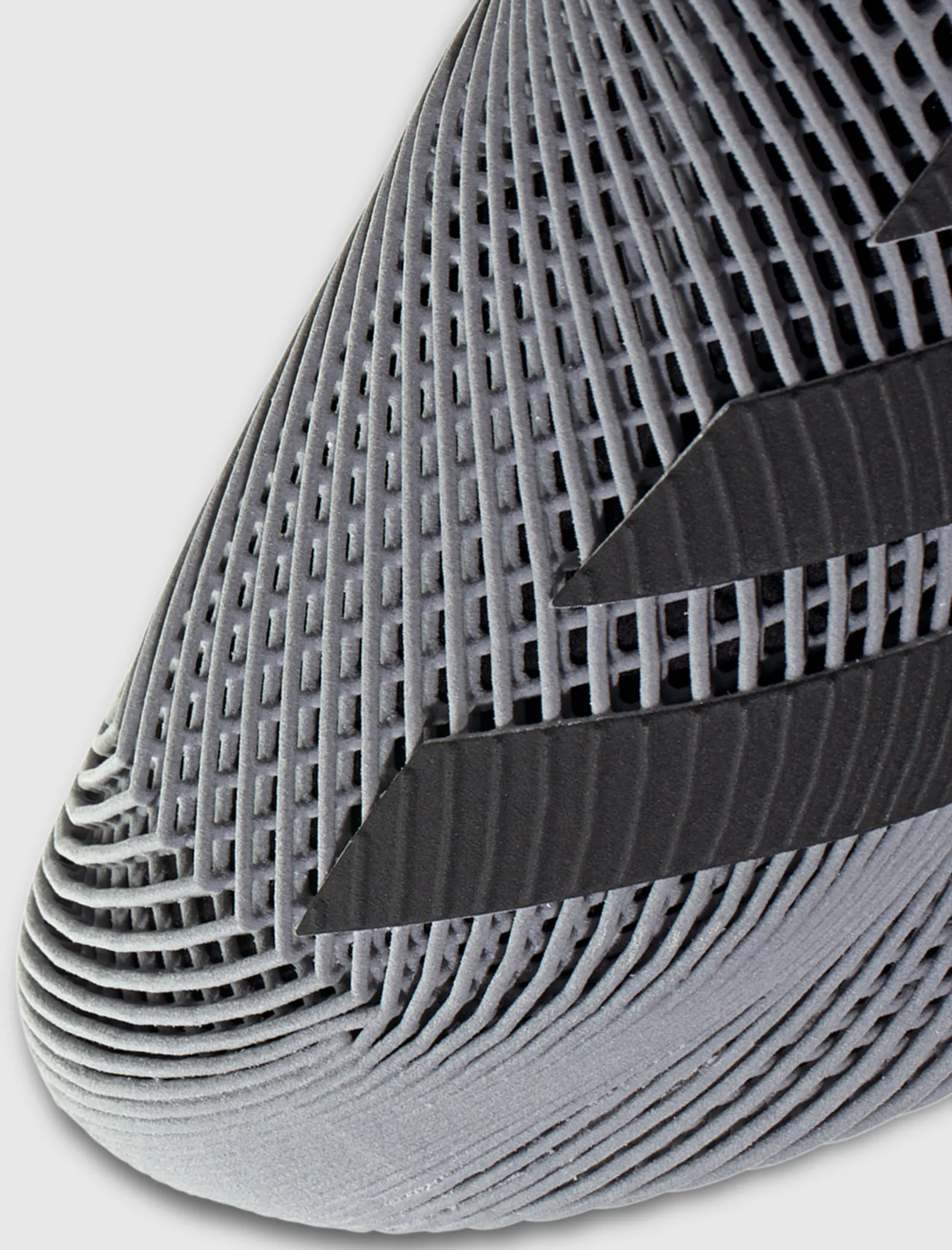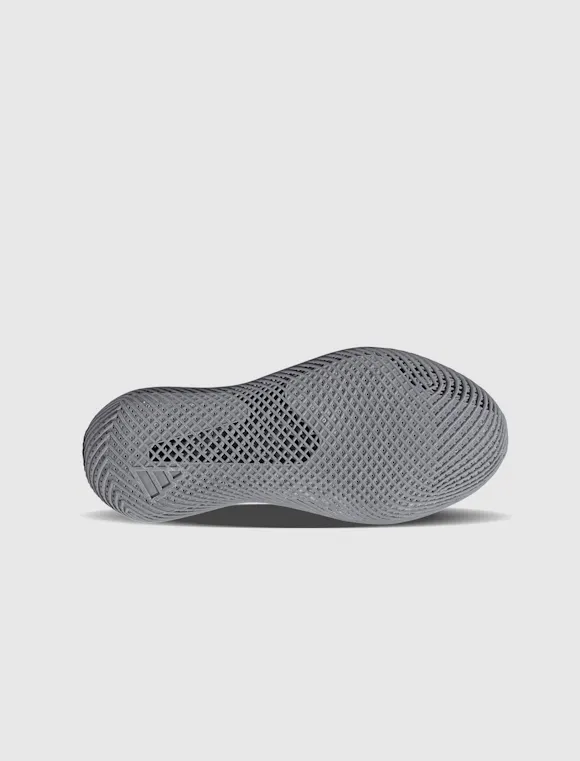 Low top shoe. One-piece 3D printed lattice upper. Uses Climacool technology for airflow. Stripe motifs printed on the outer side panels. 3D printed polymer