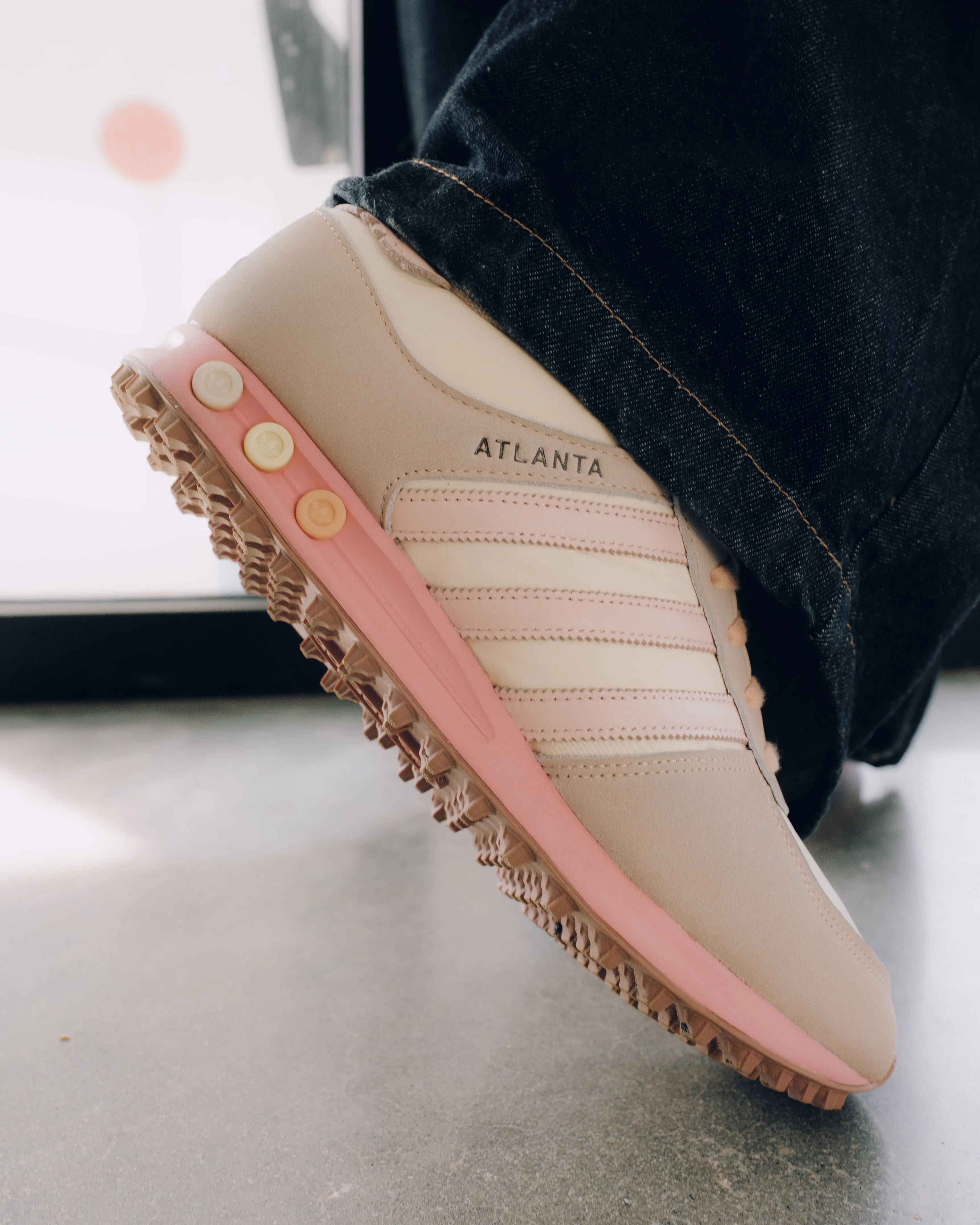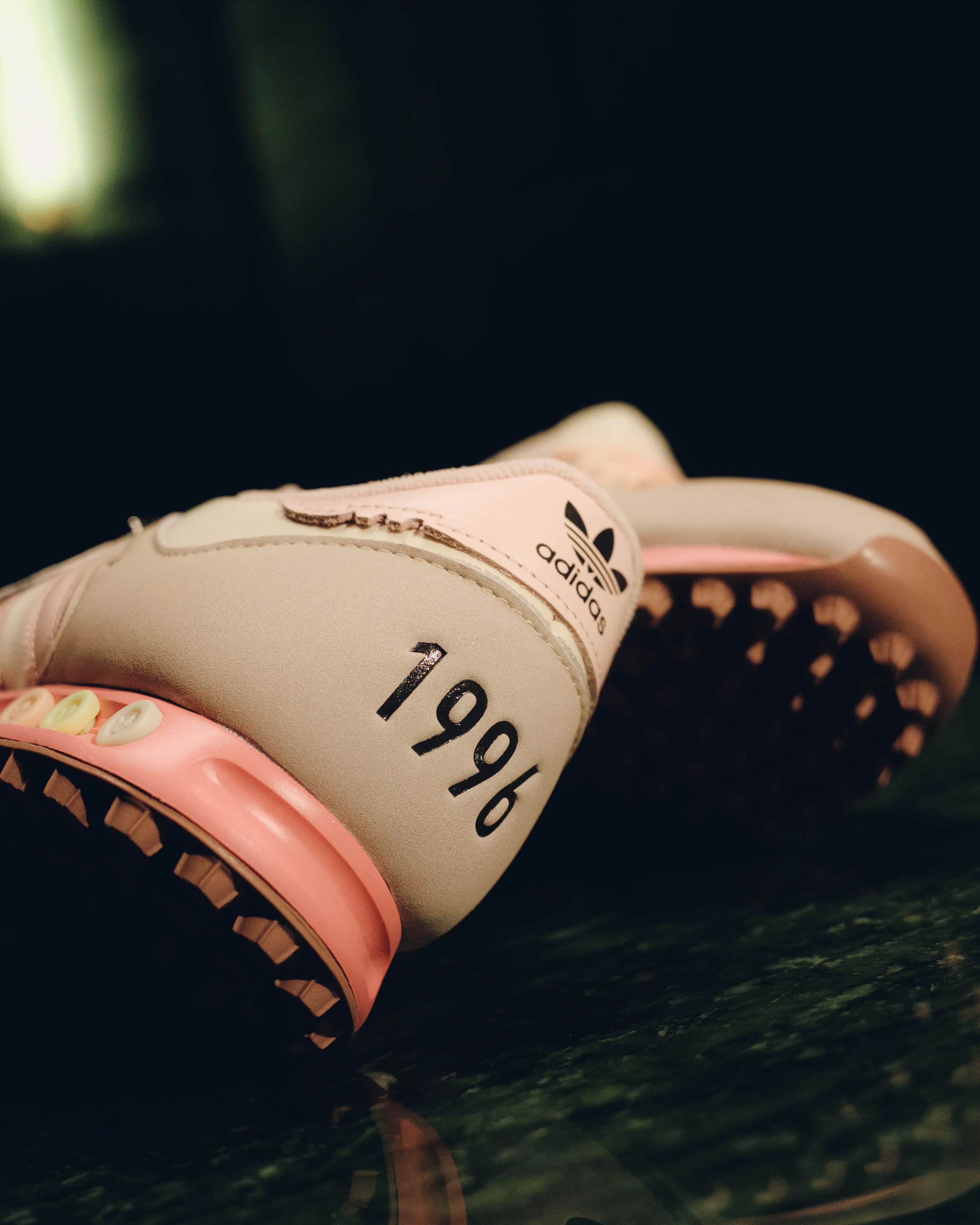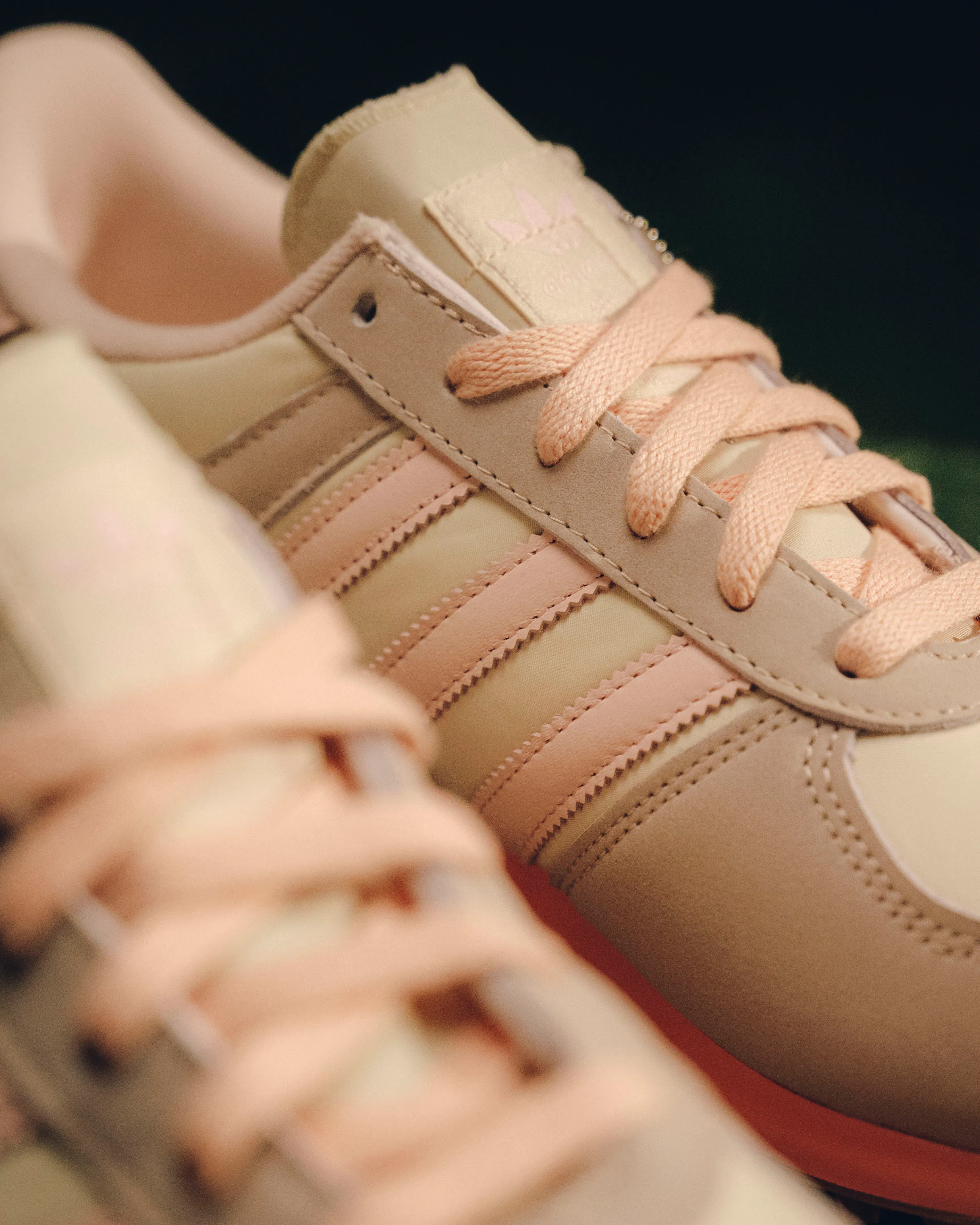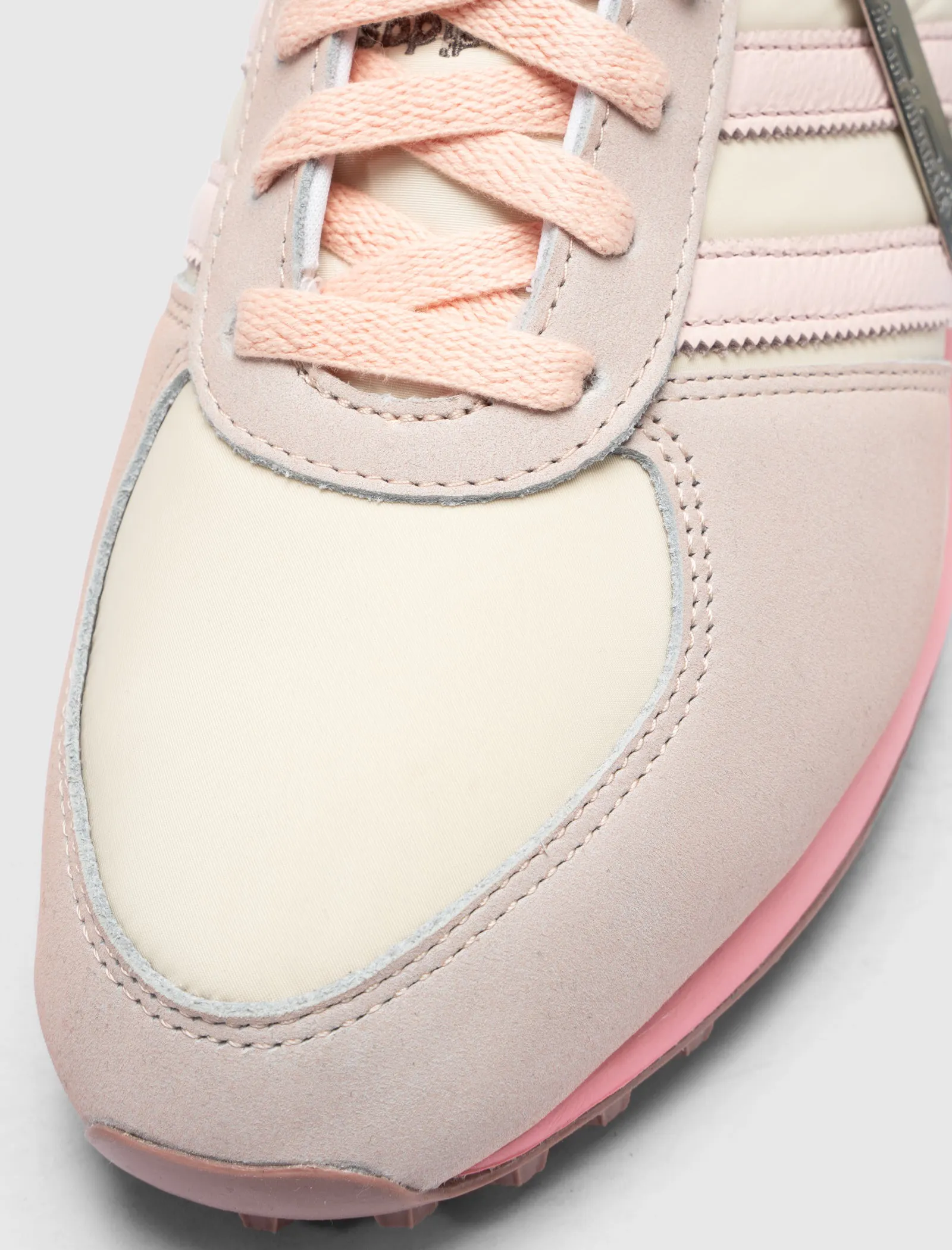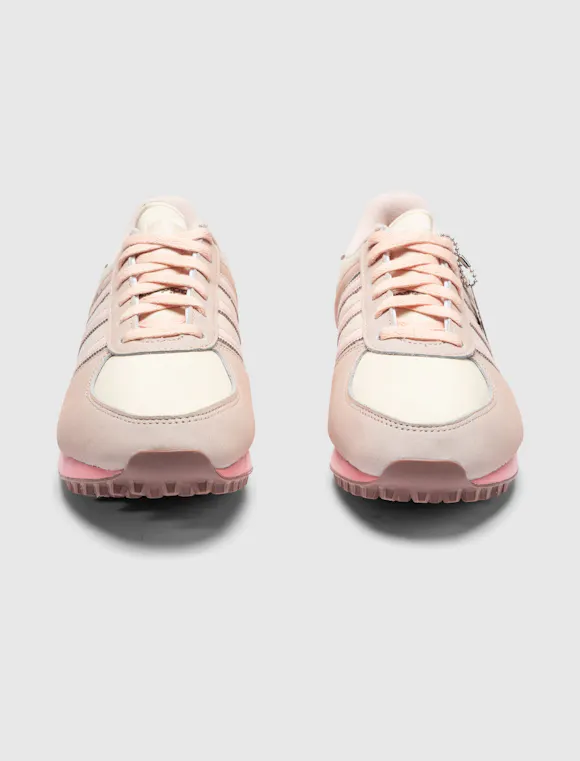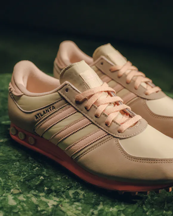 Low top sneakers. Mesh upper. Suede overlays around the toe, eyelet panels, and heel counter. Leather stripe motif patches on the side panels. Leather tongue. Front lacing. Composite foam midsole wrapping in nylon netting. Rubber outsole. Suede, and mesh upper