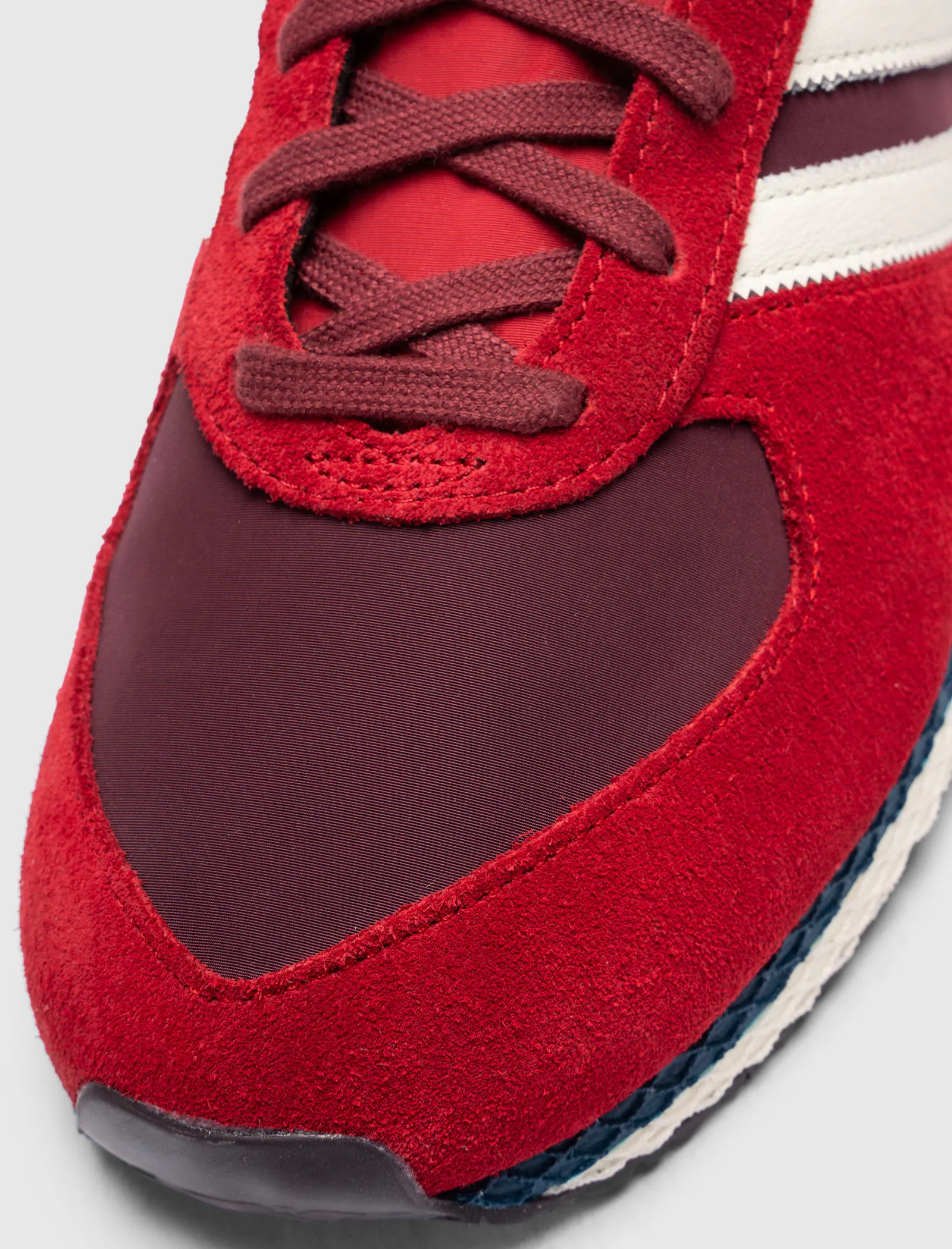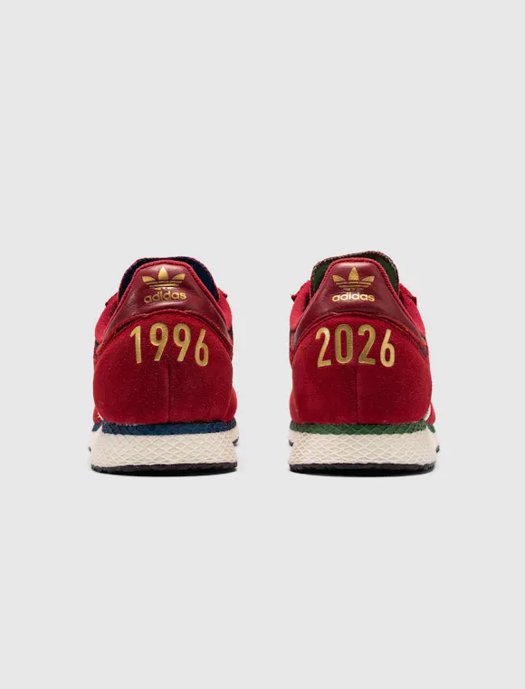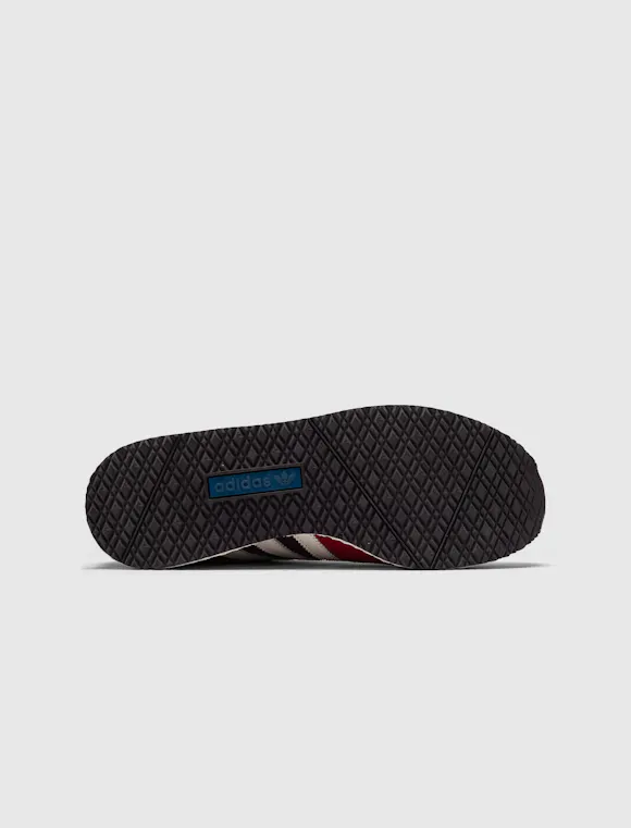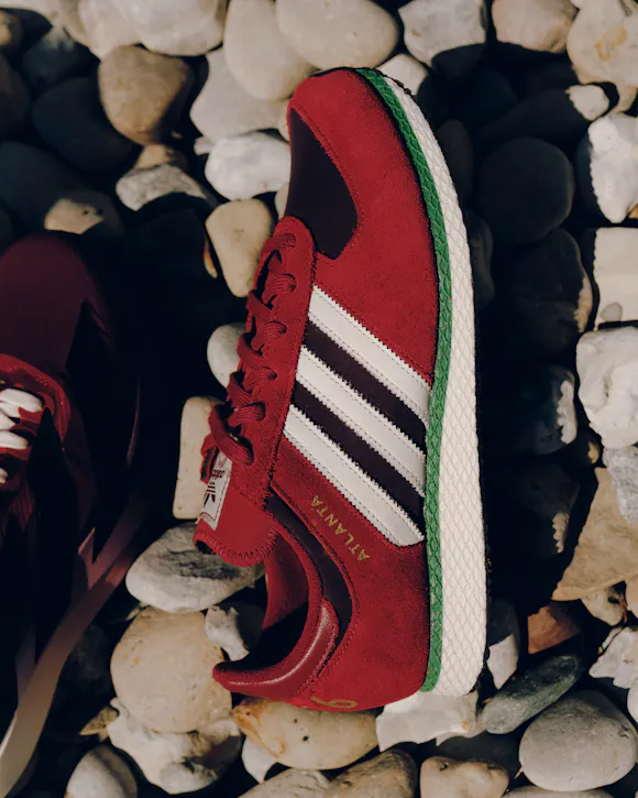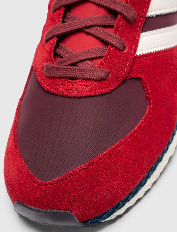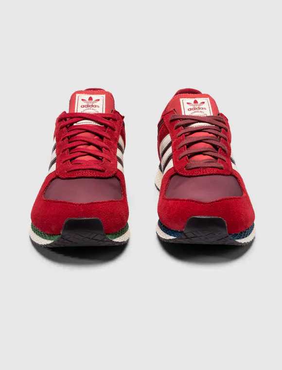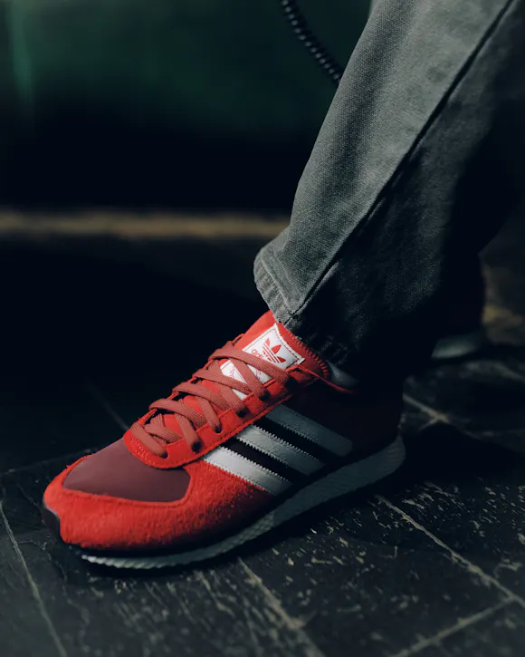 Low top sneakers. Mesh upper. Suede overlays around the toe, eyelet panels, and heel counter. Leather stripe motif patches on the side panels. Leather tongue. Front lacing. Composite foam midsole wrapping in nylon netting. Rubber outsole. Suede, and mesh upper
