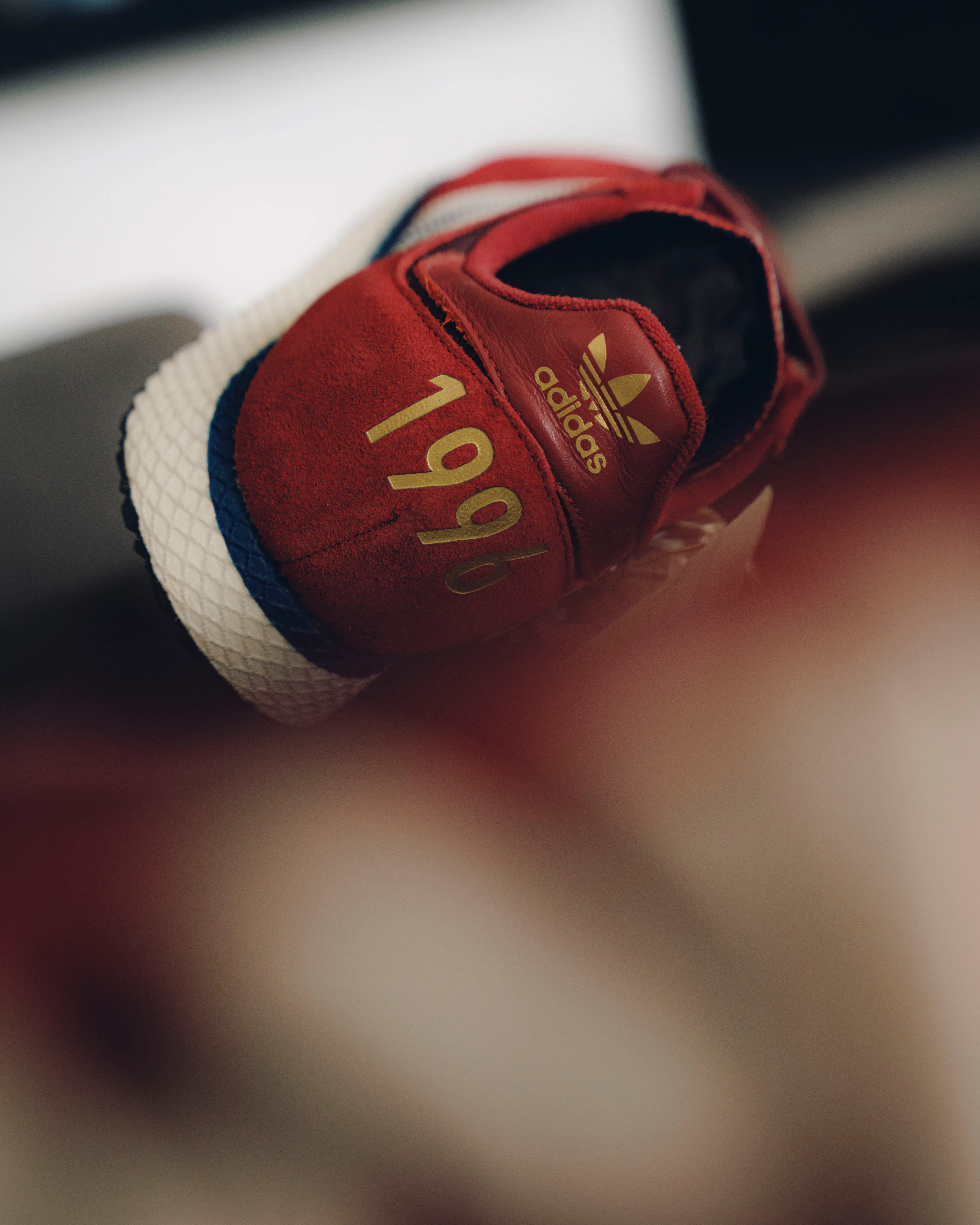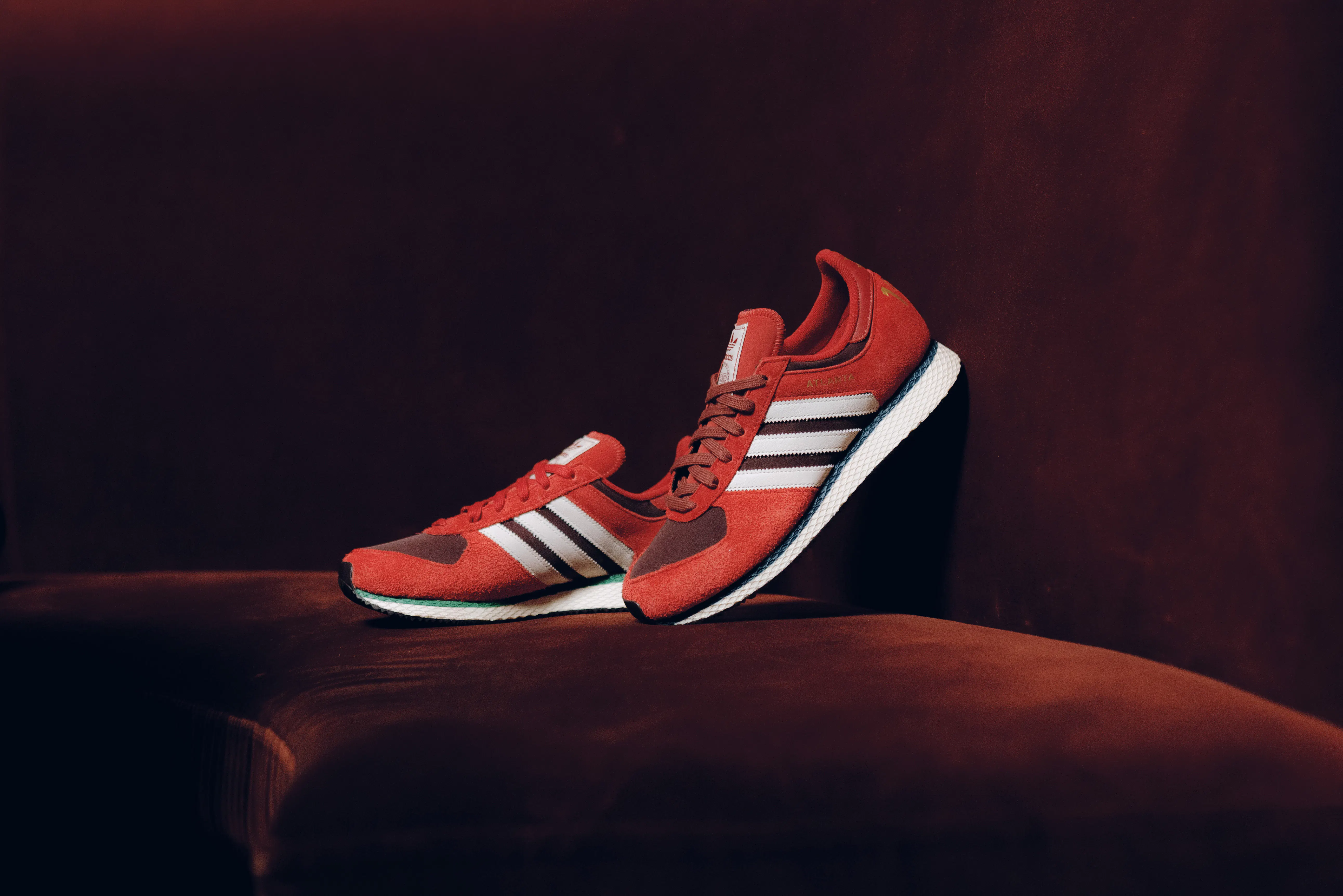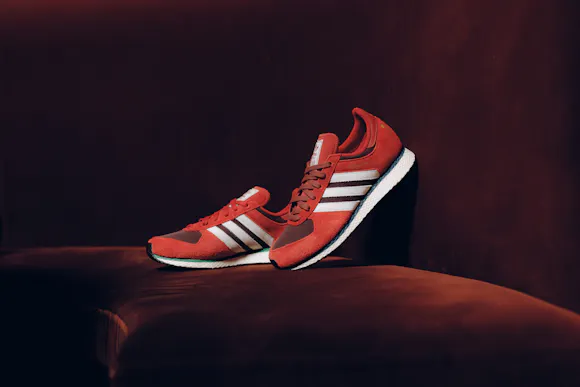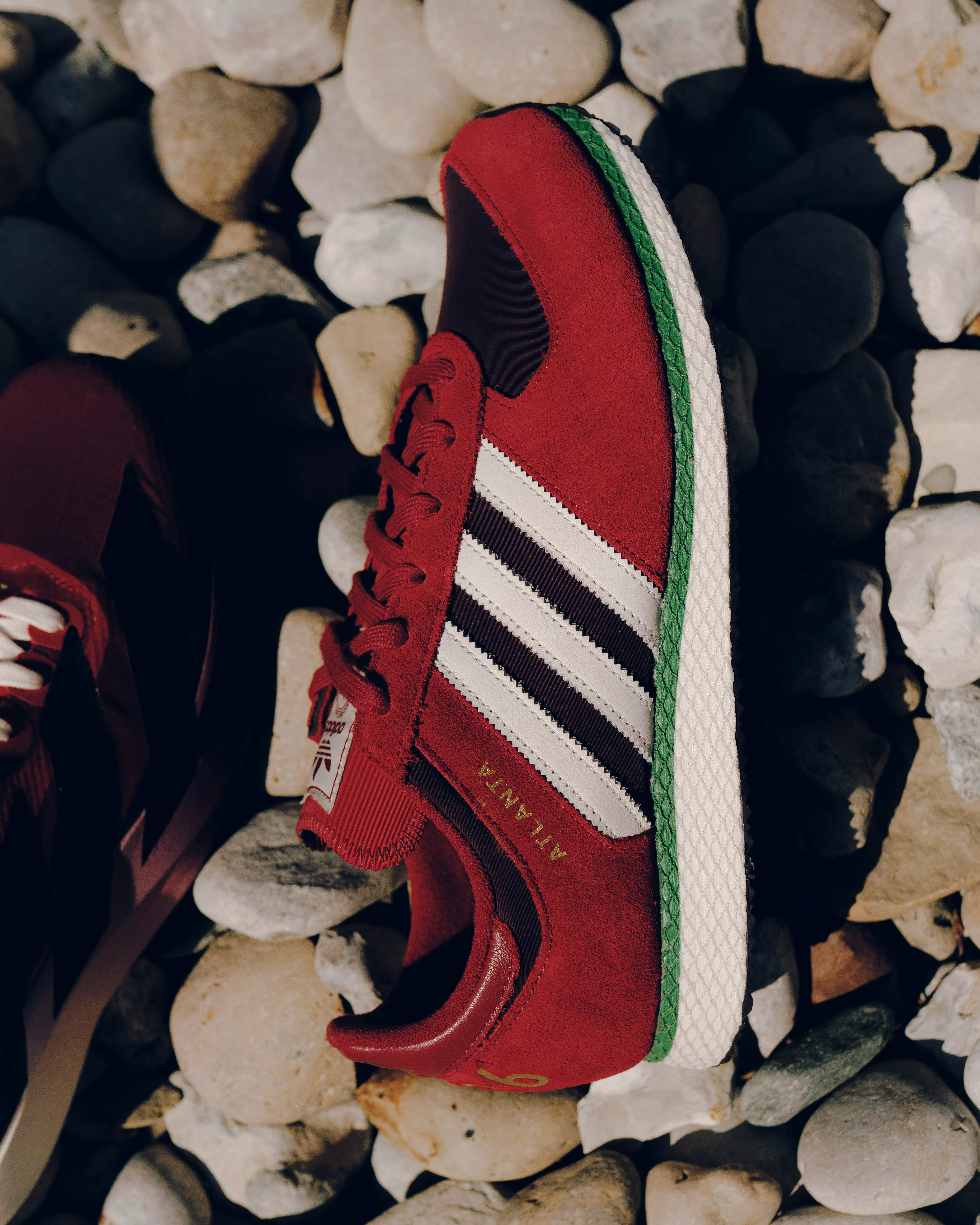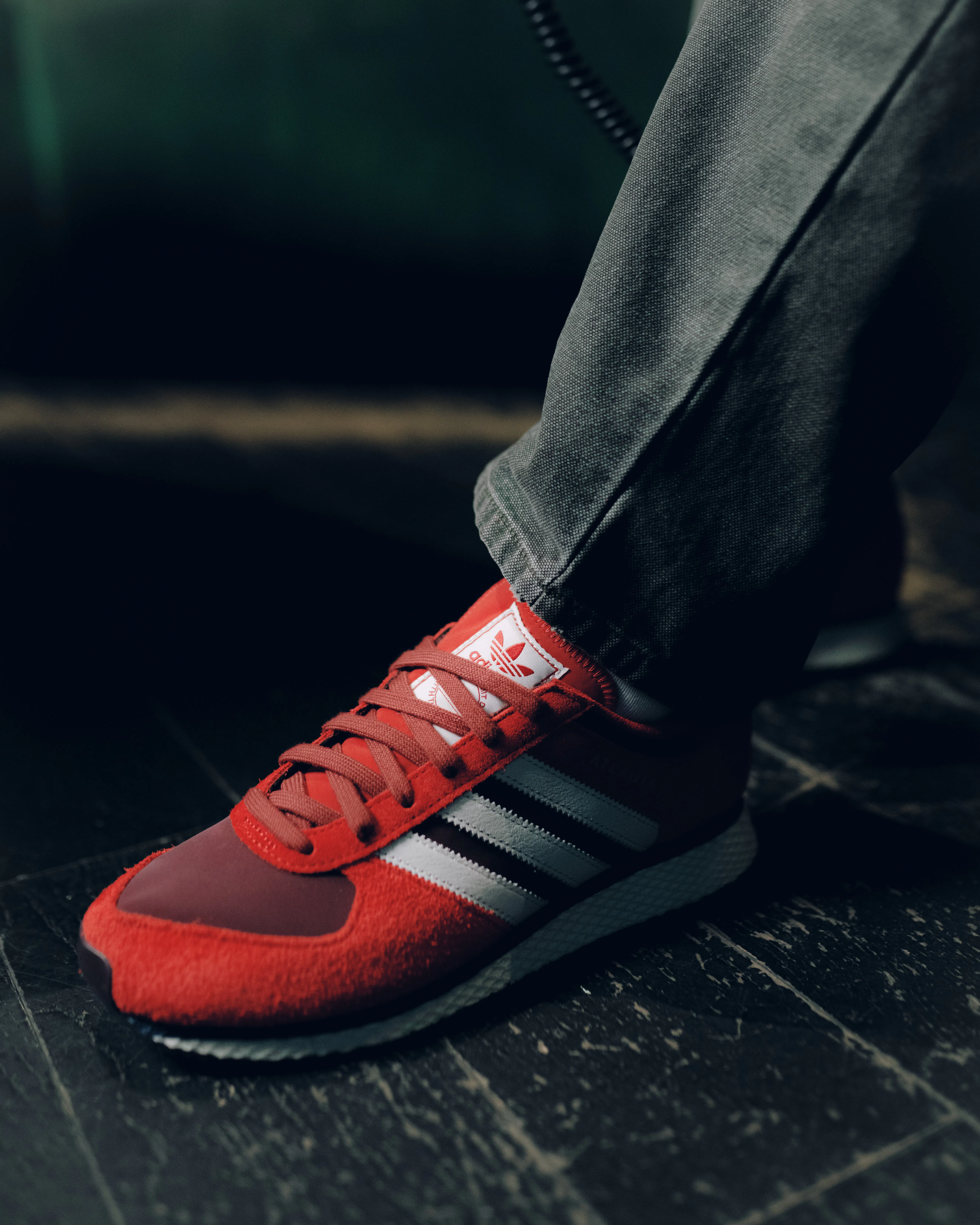 Low top sneakers. Mesh upper. Suede overlays around the toe, eyelet panels, and heel counter. Leather stripe motif patches on the side panels. Leather tongue. Front lacing. Composite foam midsole wrapping in nylon netting. Rubber outsole. Suede, and mesh upper